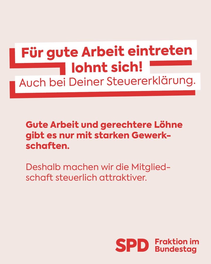 Gute Arbeit und gerechtere Löhne gibt es nur mit starken Gewerkschaften! Deshalb machen wir die Mitgliedschaft in Gewerkschaften steuerlich noch attraktiver.Was ändert sich konkret? Gewerkschaftsbeiträge können künftig zusätzlich zum Arbeitnehmer-Pauschbetrag als Werbungskosten abgezogen...